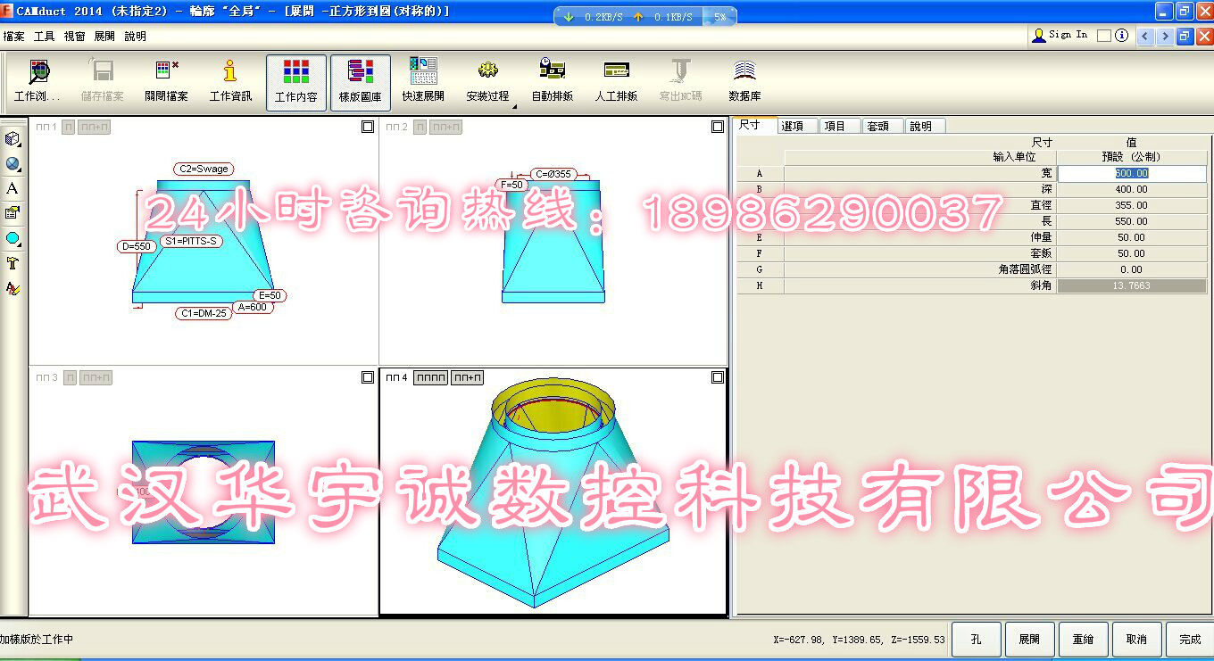 9、隨機(jī)配套提供風(fēng)管展開切割專用軟件,無需掌握復(fù)雜的繪制及計(jì)算。只需選擇相應(yīng)的風(fēng)管類型,輸入簡單參數(shù)即可自動(dòng)生成加工程序進(jìn)行切割加工。